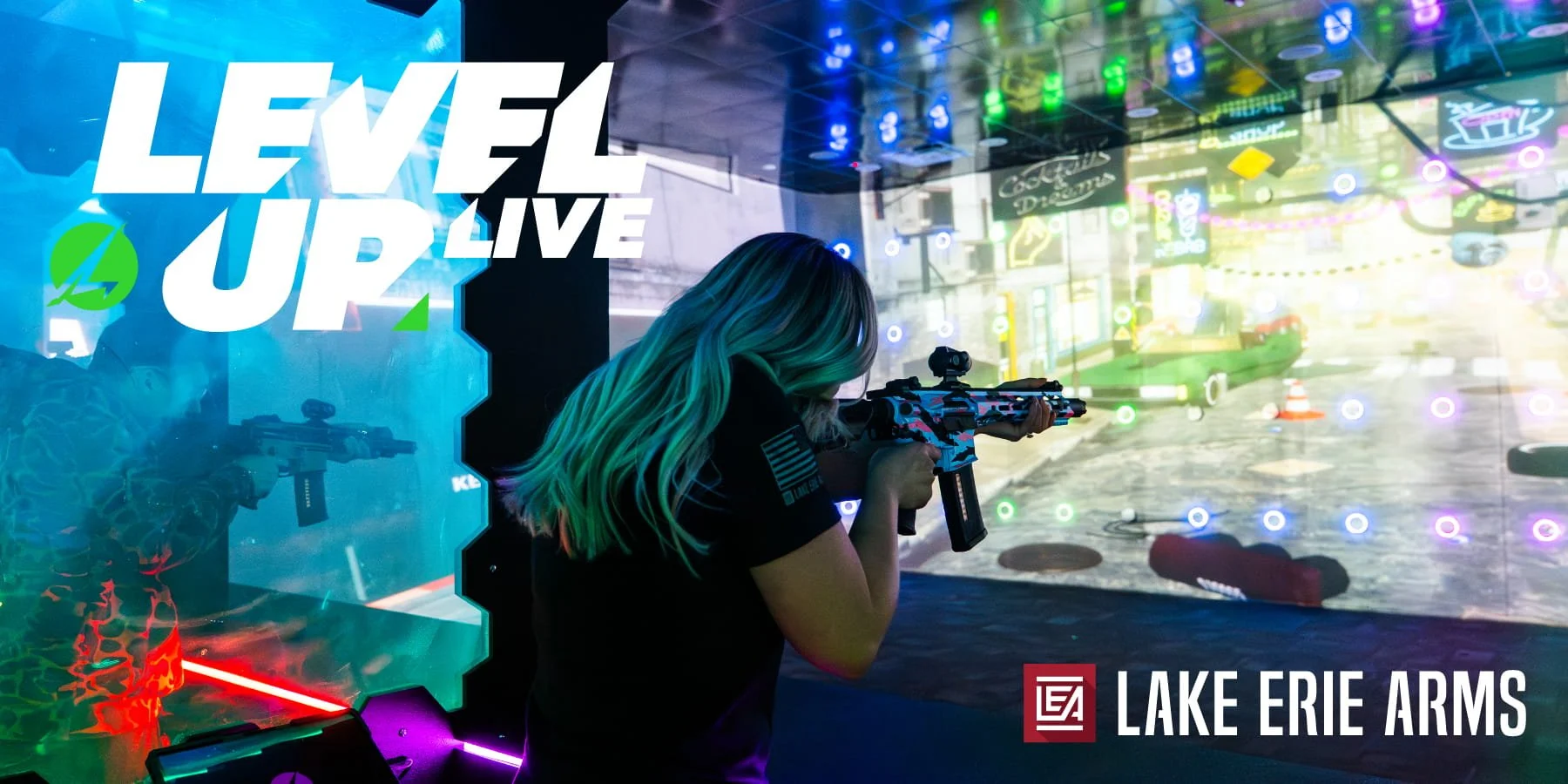 Immerse yourself in a shooting experience unlike any other. This state-of-the-art indoor airsoft range will transport you into an interactive zone of heart pounding action and excitement. Level Up your game and compete against family and friends in this fully Immersive Airsoft Experience