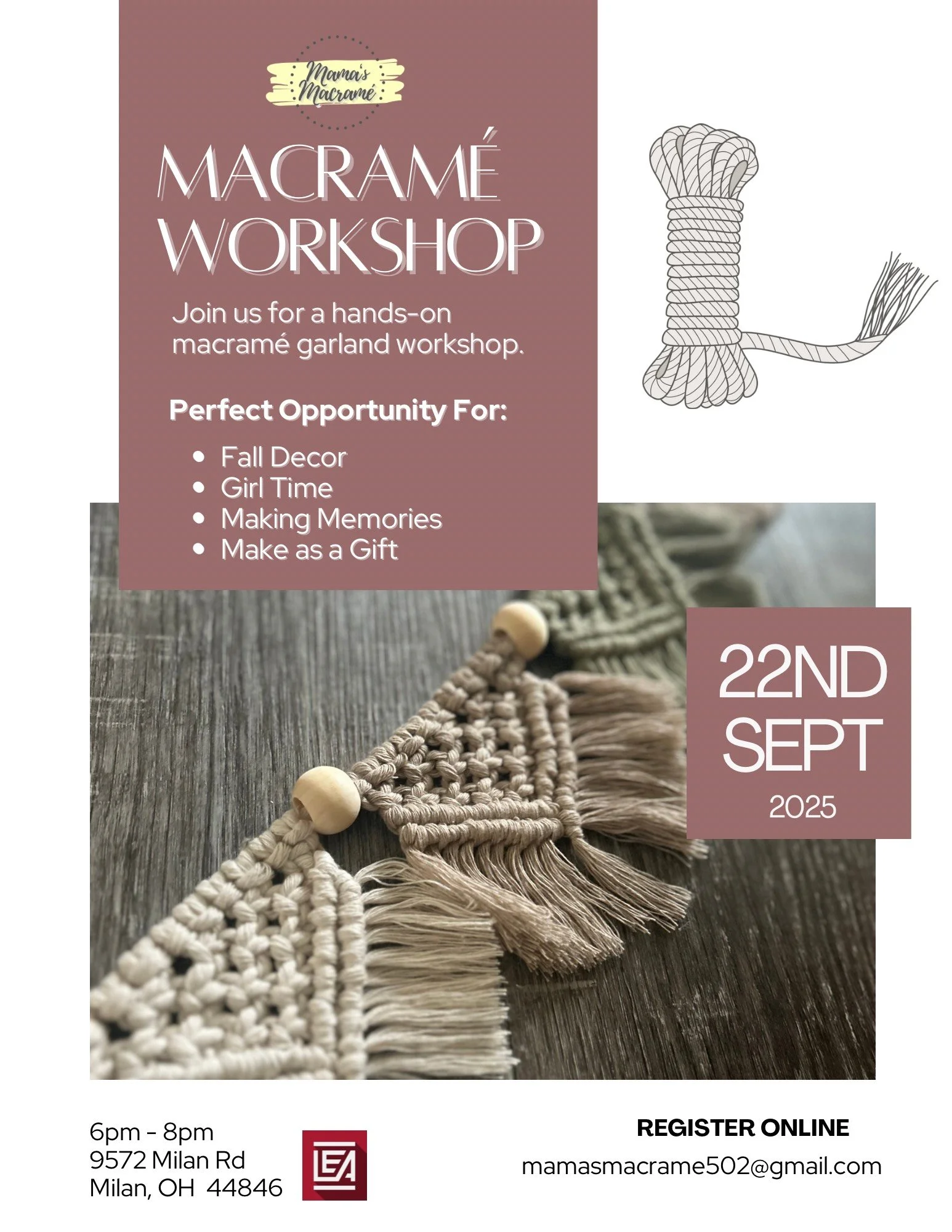 Join us for a beginner friendly macrame classes. Brandy will teach you step-by-step how to create a beautiful Macramé garland and you’ll have fun doing it.