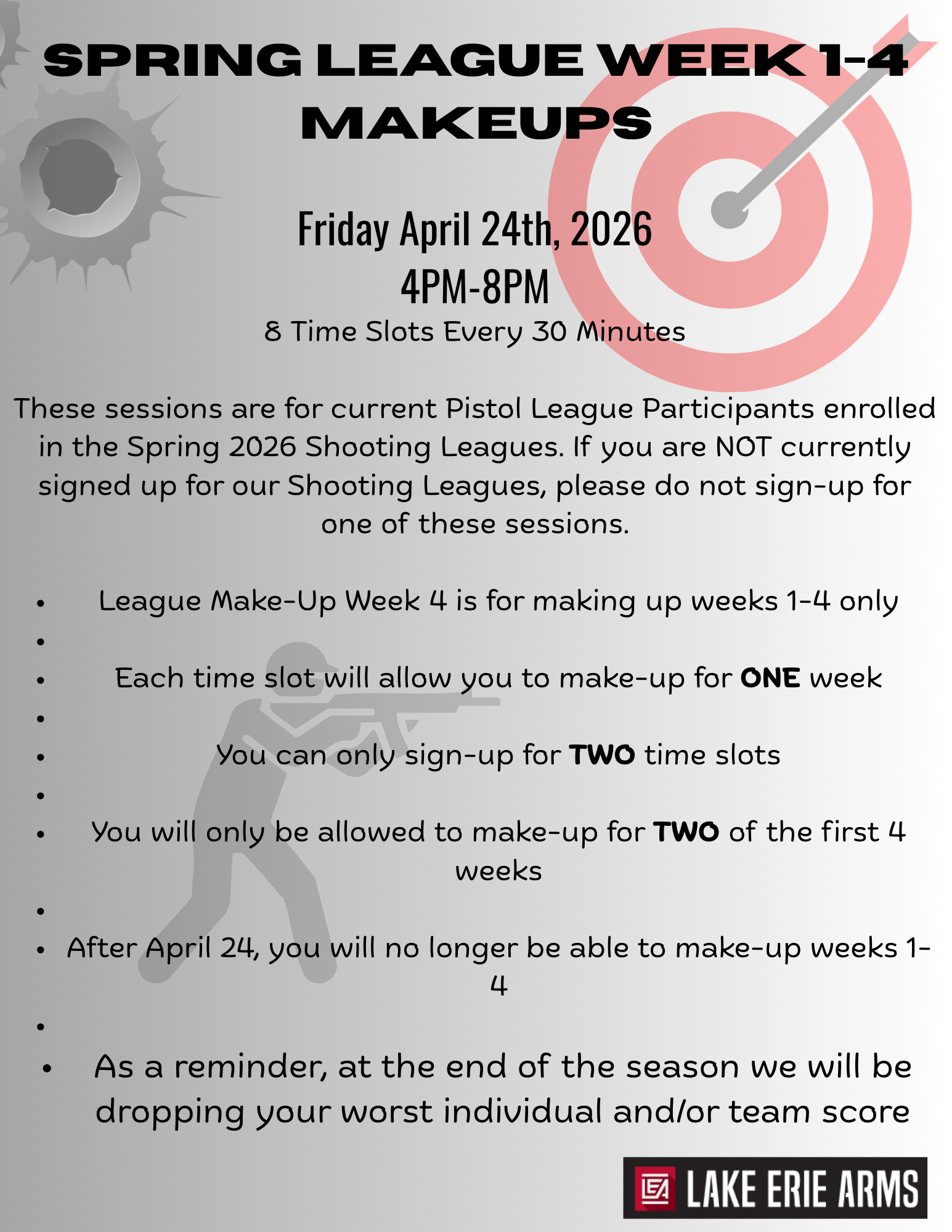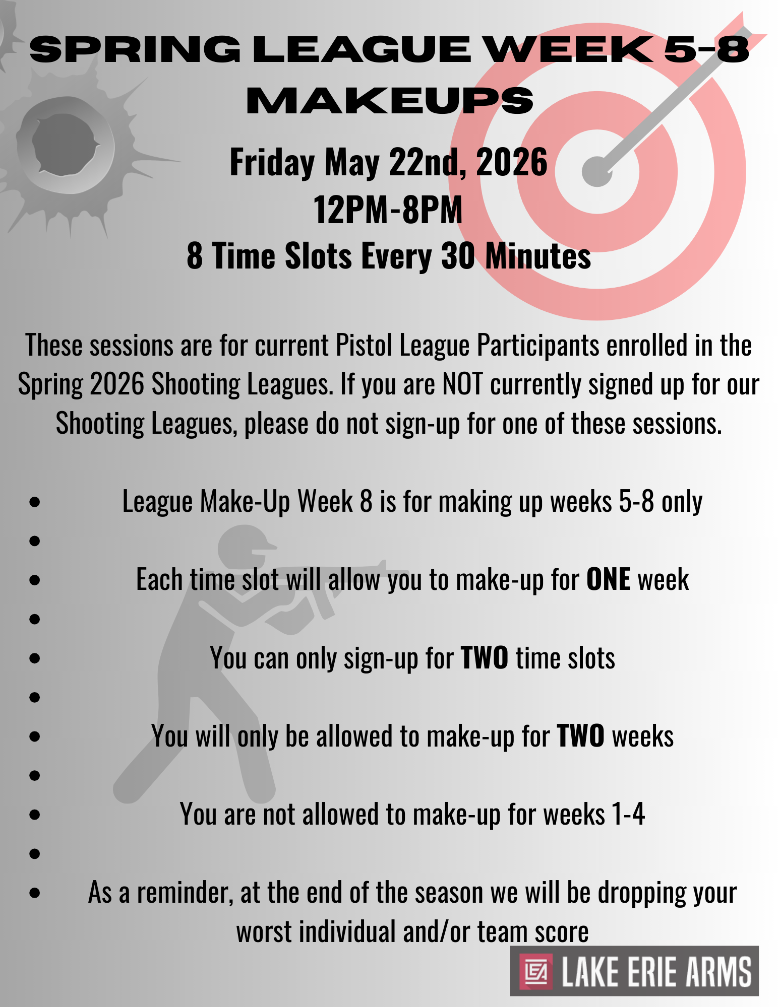 Please call Lake Erie Arms front desk to register at 419-433-8200 if you are a current league participant for a discount!